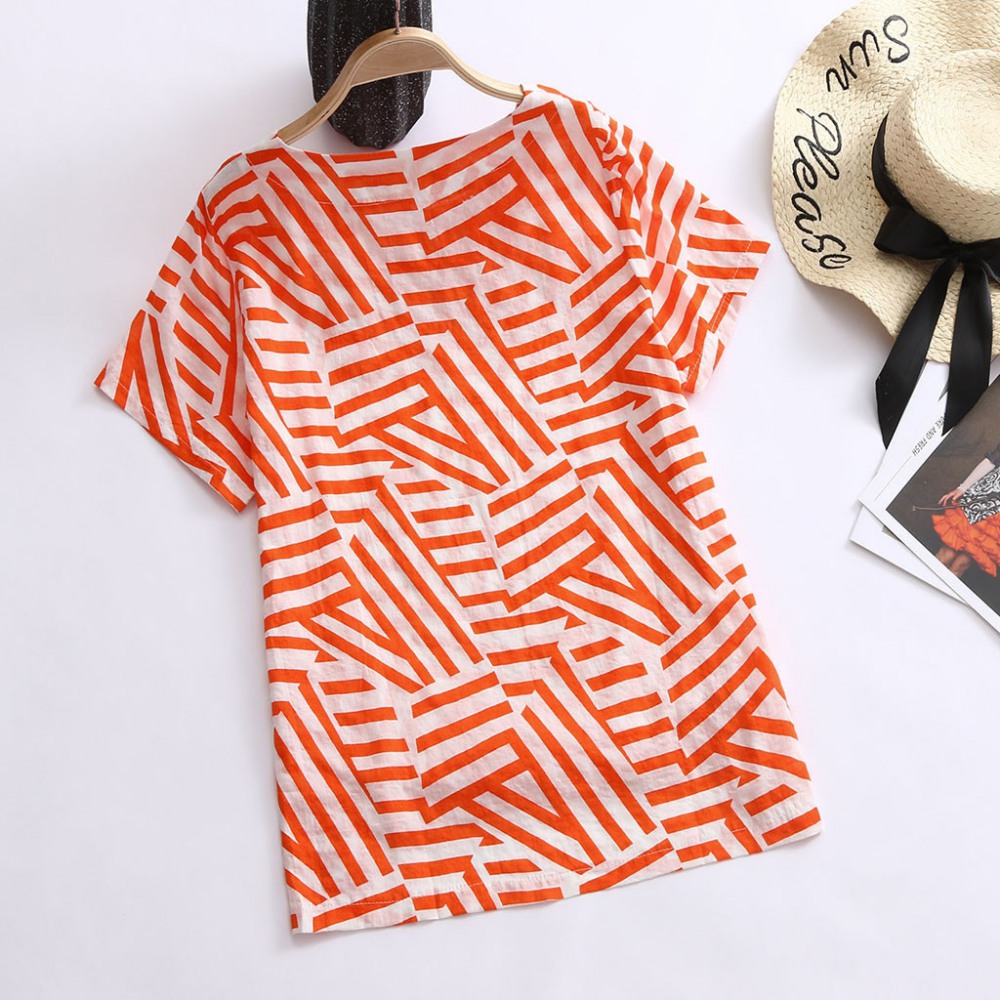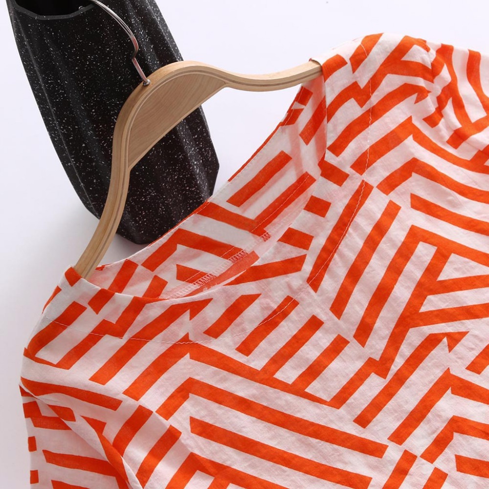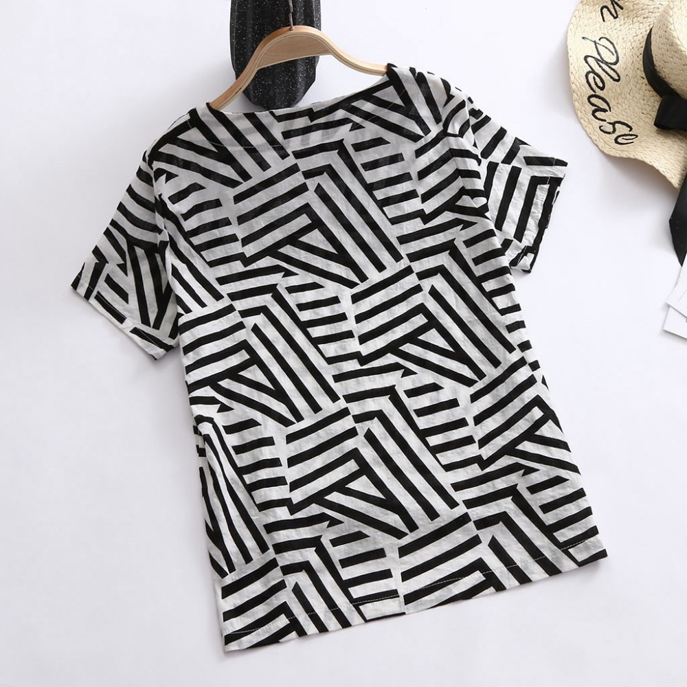 Explosive Retro Geometric Cotton and Linen Loose New Round Neck T-Shirt